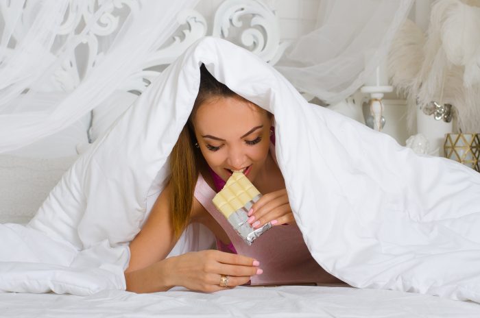 No doubt you’ve been told that cutting out caffeine is the key to a good night’s sleep so why drink coffee or treat yourself to that chocolate bar right before bedtime? Even if you drink a latte six hours before you tuck in, caffeine can impact your slumber for up to 7 hours. Steer clear of caffeine including chocolate, nicotine, and alcohol in the evening. All of these can pep you up and interfere with your ability to fall asleep. And don’t think you’ll be safe if you sip on decaffeinated drinks either—decaf coffees, sodas, and teas still contain a bit of the stimulant. Try soothing chamomile or lemon balm tea in the afternoon or evening instead.